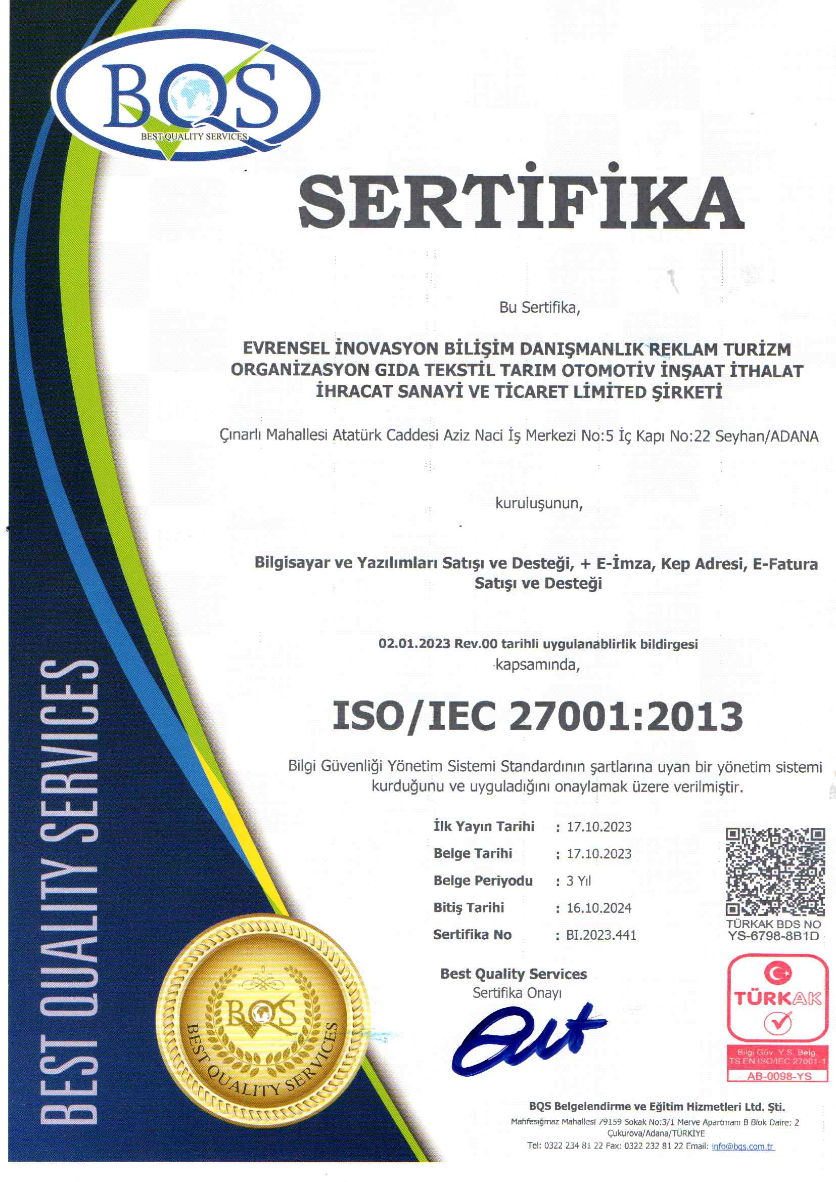 EVRENSEL İNOVASYON, 2002 yılından bu yana bilişim sektöründe faaliyet göstermekte olup 2017’den itibaren e-dönüşüm çözümleri ile Adana’nın en çok tercih edilen e-imza merkezlerinden biri haline gelmiştir. Tüm süreçlerimiz BTK onaylı elektronik sertifika hizmet sağlayıcıları ile tam uyum içinde yürütülmektedir.